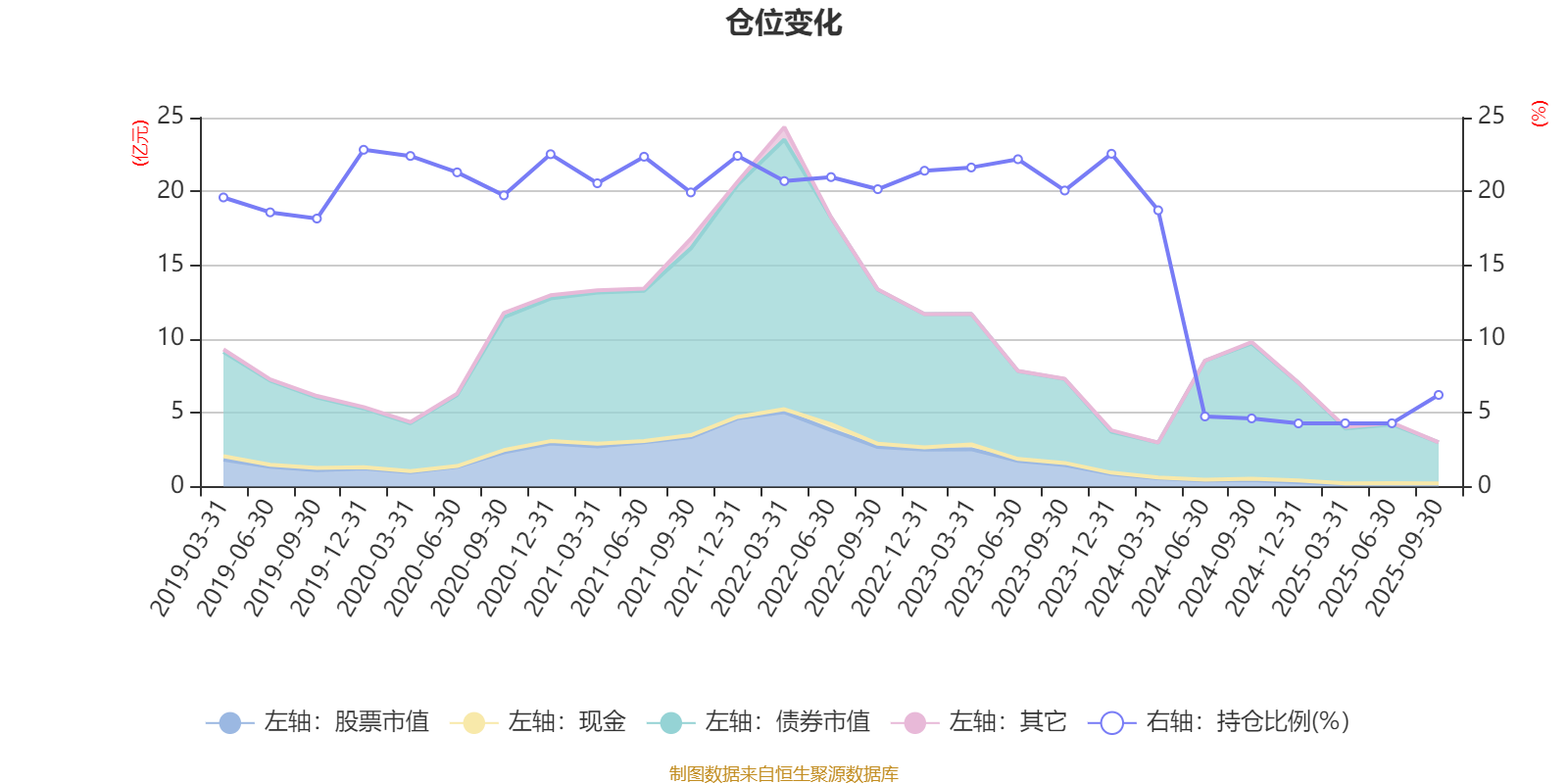 据定期报告数据统计,近三年平均股票仓位为12.91%,同类平均为19.14%。2019年末基金达到22.82%的最高仓位,2024年末最低,为4.28%。