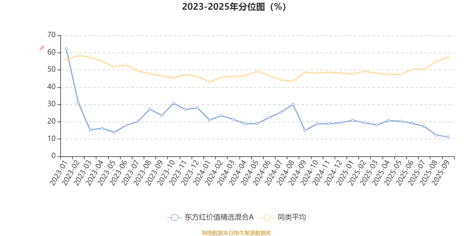 通过所选区间该基金净值增长率分位图,可以观察该基金与同类基金业绩比较情况。图为坐标原点到区间内某时点的净值增长率在同类基金中的分位数。