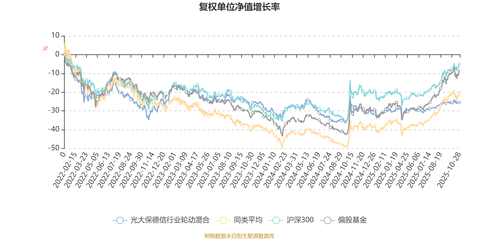 截至10月28日,光大保德信行业轮动混合近三个月复权单位净值增长率为3.49%,位于同类可比基金550/621;近半年复权单位净值增长率为6.56%,位于同类可比基金601/619;近一年复权单位净值增长率为2.30%,位于同类可比基金590/611;近三年复权单位净值增长率为13.27%,位于同类可比基金298/518。