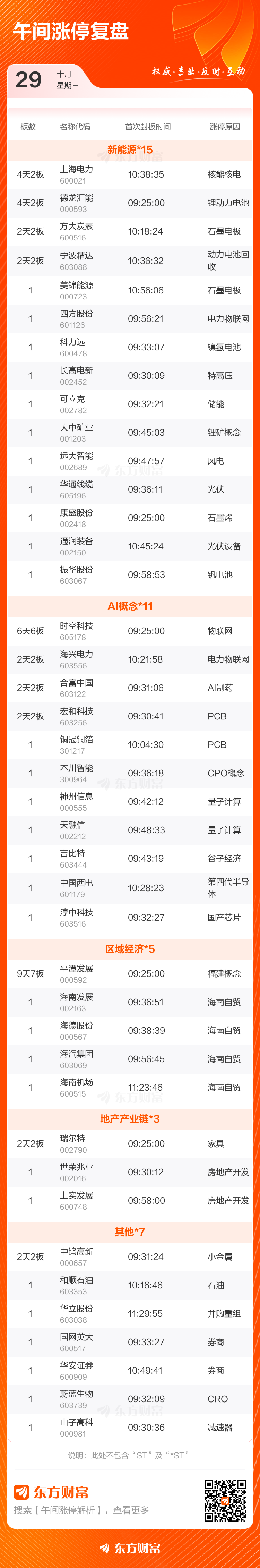 10月29日午间涨停复盘:45股涨停 上海电力4天2板