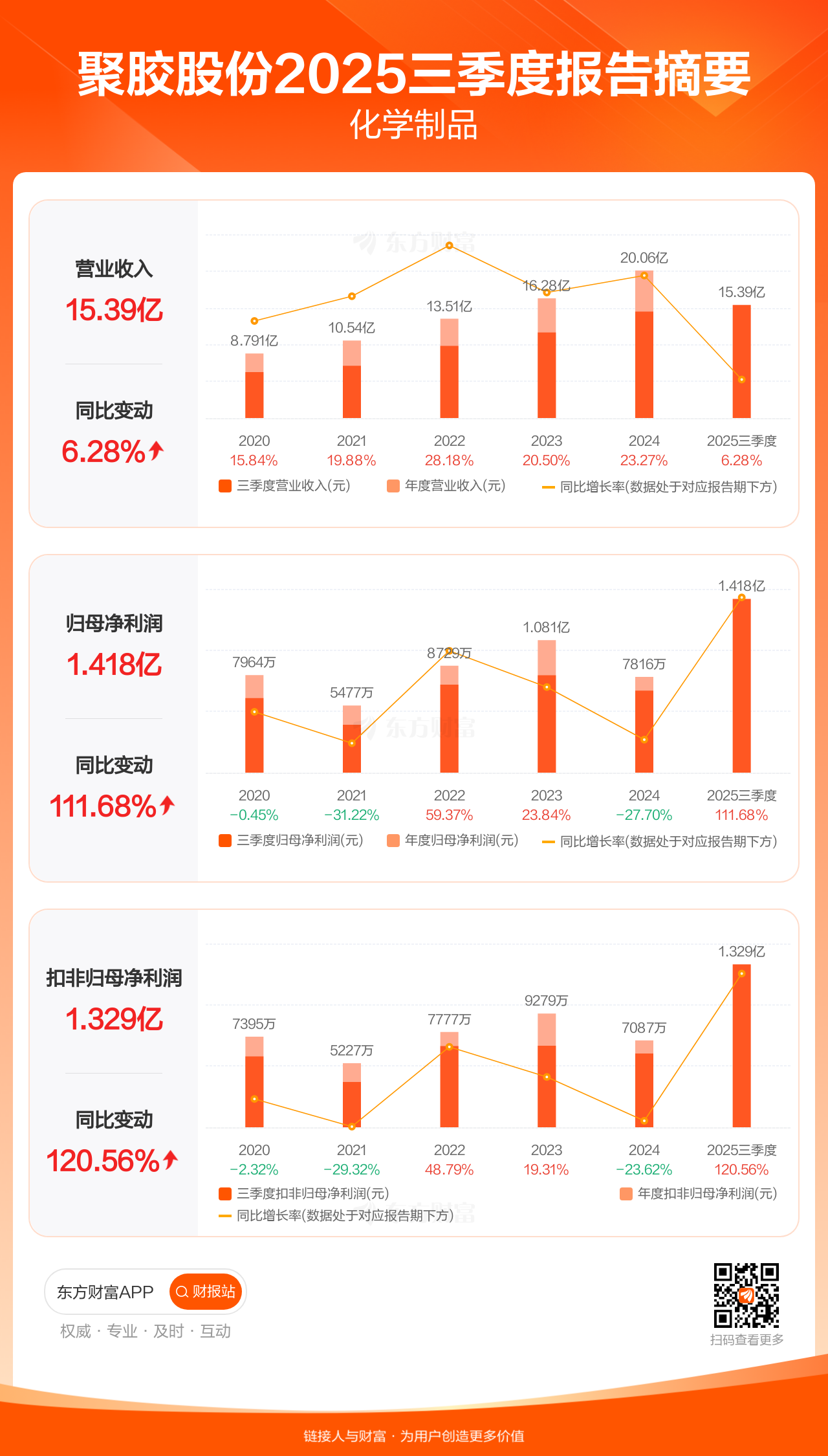 聚胶股份10月27日发布2025年三季报显示,公司前三季实现营业收入15.39亿元,同比增长6.28%;归母净利润1.42亿元,同比增长111.68%;扣非归母净利润1.33亿元,同比增长120.56%。