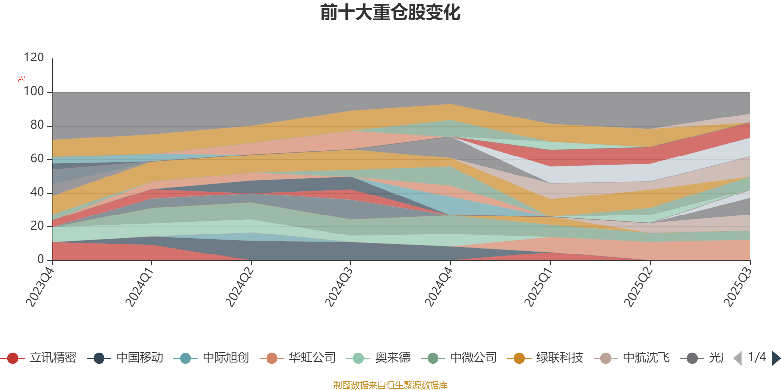 基金管理人在三季报中表示,2025 年三季度的市场经历了继续延续着趋势性上涨行情。2025 年三季度,基金经理维持了对先进制程 FAB 厂等的高仓位,主要增加配置的方向是国产算力方向,看好高成交量市场下方向性资产的定价扩张。