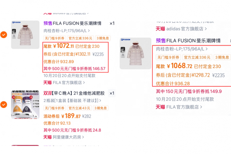 “我用了500元无门槛9折券,凑单后反而比单独买还要贵。”济南的刘女士在淘宝买了一件斐乐羽绒服,单独购买价格为1298.72元,凑单后价格涨为1302.11元;澳贝卫生纸抽单独买123.74元,凑单后反而为126.88元。