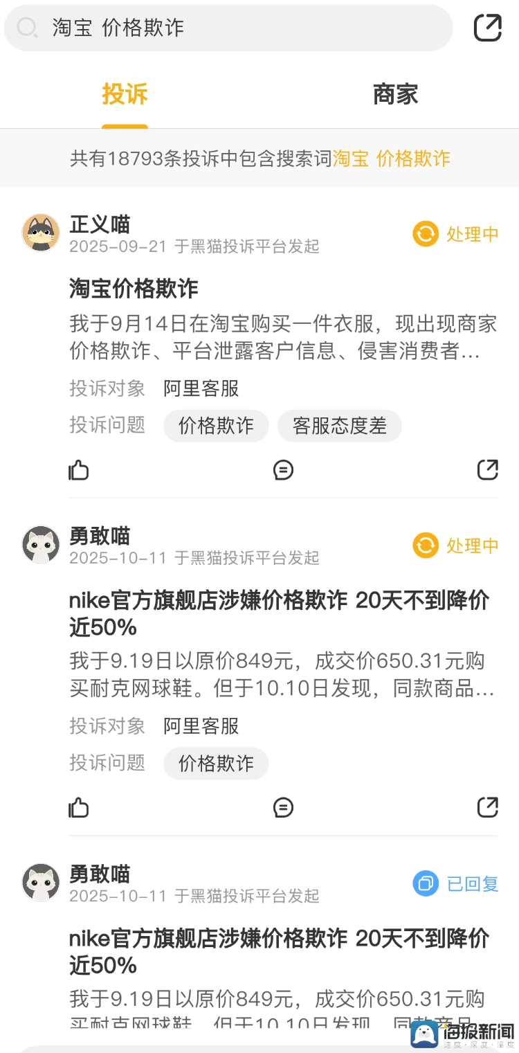 这种落差让消费者转向竞品。“京东同型号空调,标价直接减300,不用算满减,最后和淘宝用券后一个价。”广州消费者黄先生对比后放弃淘宝,“京东不用付定金就是那个价格,而且还有焕新补贴,我转战京东了”。数据显示,京东双十一投诉回复率100%,成为价格乱象中的“避风港”。