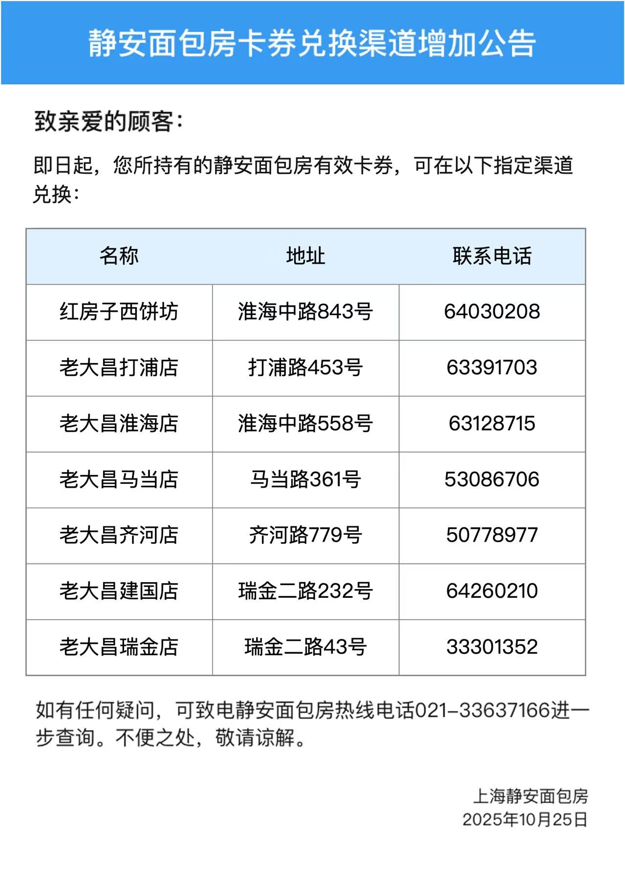 针对消费者关注的卡券问题,静安面包房于10月25日深夜通过官方微信发布公告,宣布自即日起,消费者持有的有效卡券可在红房子西饼坊、老大昌等品牌的部分门店进行兑换。