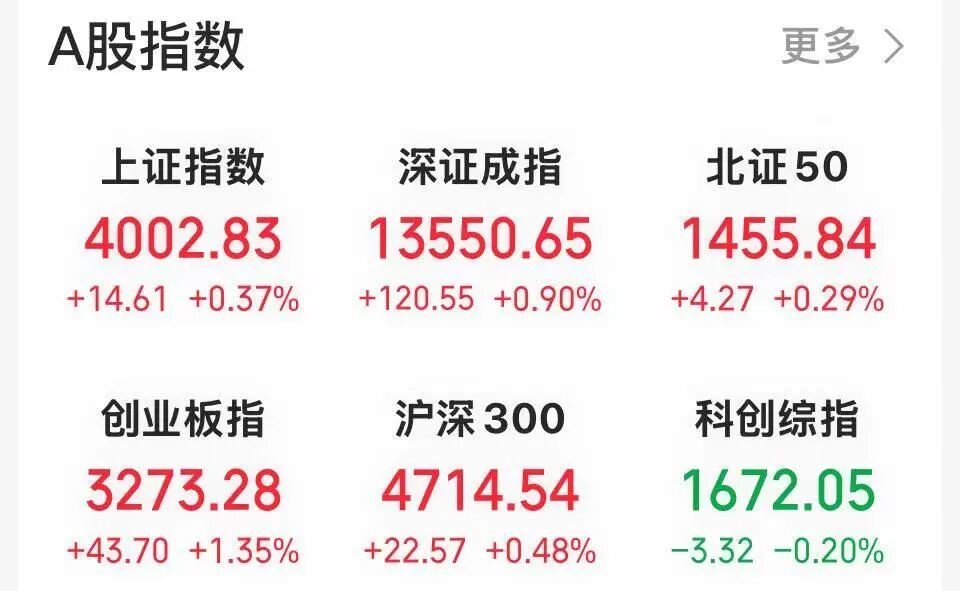 今日早盘,A股市场再度冲高,“牛市旗手”券商板块集体升温,推动沪指重返4000点大关,创业板指则在AI主线的带动下涨超1%。截至午间休市,上证指数报4002.83点,涨0.37%;深证成指、创业板指分别上涨0.90%和1.35%。
