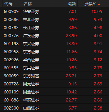截至午盘,申万证券行业指数上涨2.26%。个股方面,华安证券涨停;东北证券上涨9.73%,盘中触及涨停;长江证券、广发证券、东方证券等涨超3%。