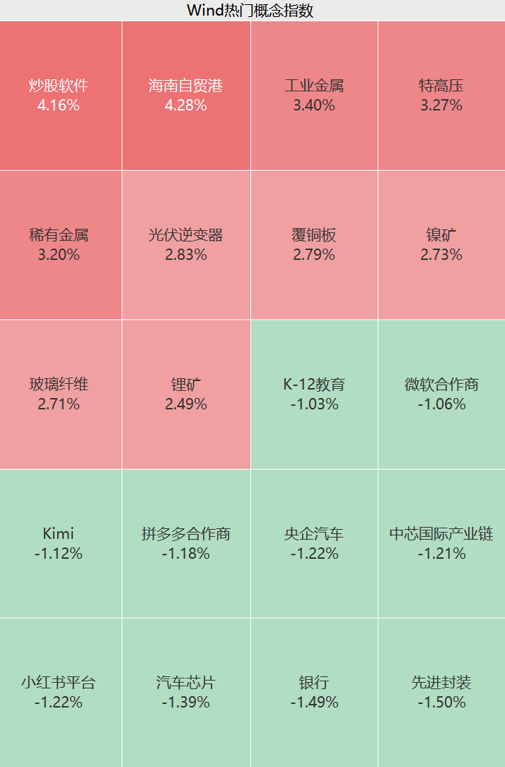 盘面上,上午有色金属、电力设备、非银金融等板块走高,海南自贸区、炒股软件、特高压、稀有金属等概念股活跃;银行、先进封装、芯片、零售等板块跌幅居前。