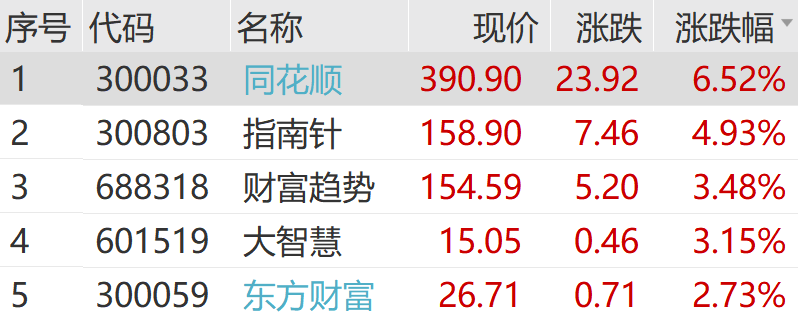 炒股软件概念股同步走高,同花顺、指南针等均有明显涨幅。