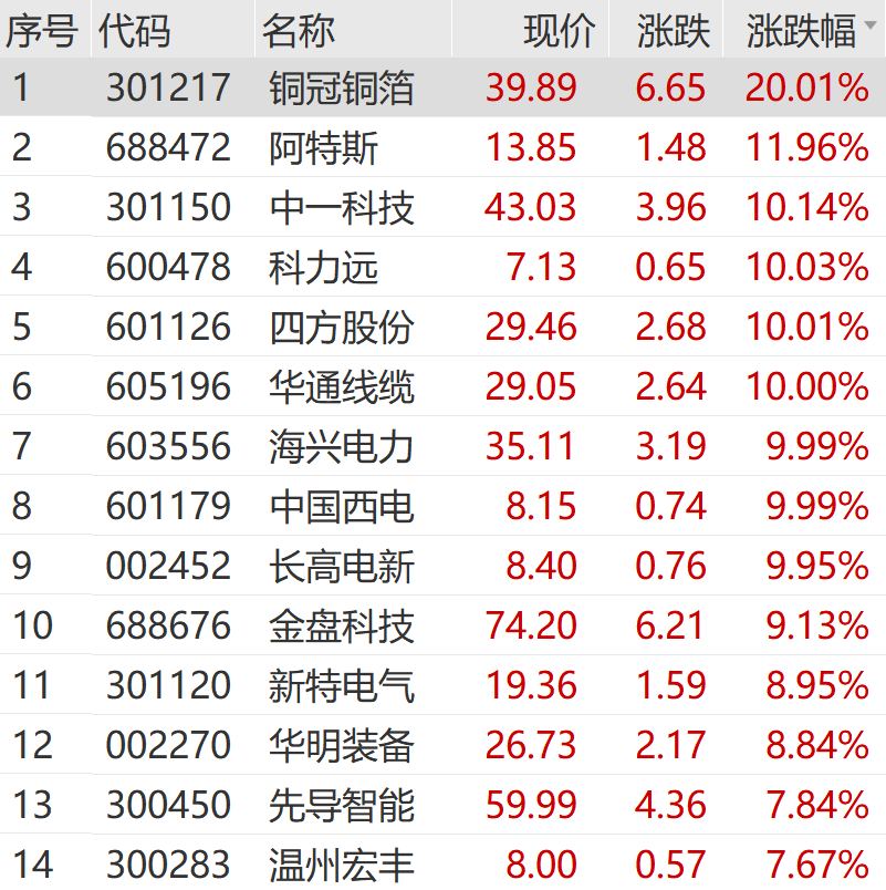 10月29日上午,A股电力设备板块震荡拉升,特高压、覆铜板等概念股活跃。个股方面,铜冠铜箔20cm涨停,科力远、四方股份等多股涨停。