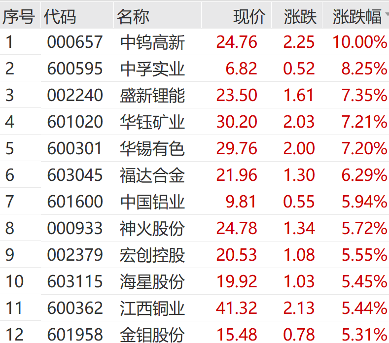10月29日上午,有色板块盘中发力,钨概念股表现亮眼。中钨高新连续2日涨停,中孚实业、盛新锂能、华钰矿业、华锡有色等跟涨。