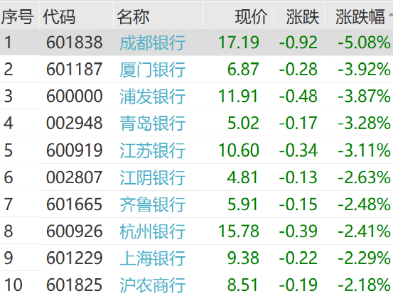截至午间收盘,成都银行跌超5%,厦门银行、浦发银行跌近4%,青岛银行、江苏银行、江阴银行等跌幅居前。