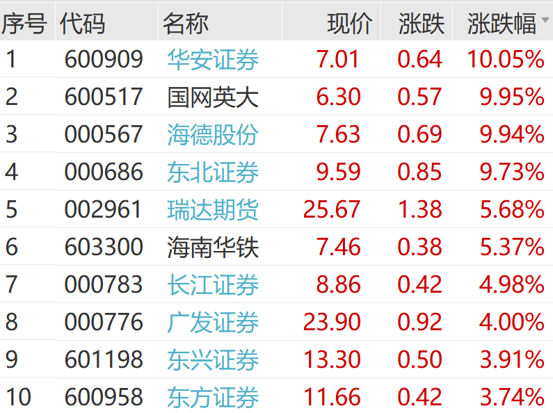 10月29日上午,非银金融板块盘中走高,“牛市旗手”券商股再度发力。截至午间收盘,华安证券、国网英大、海德股份涨停,东北证券接近涨停。