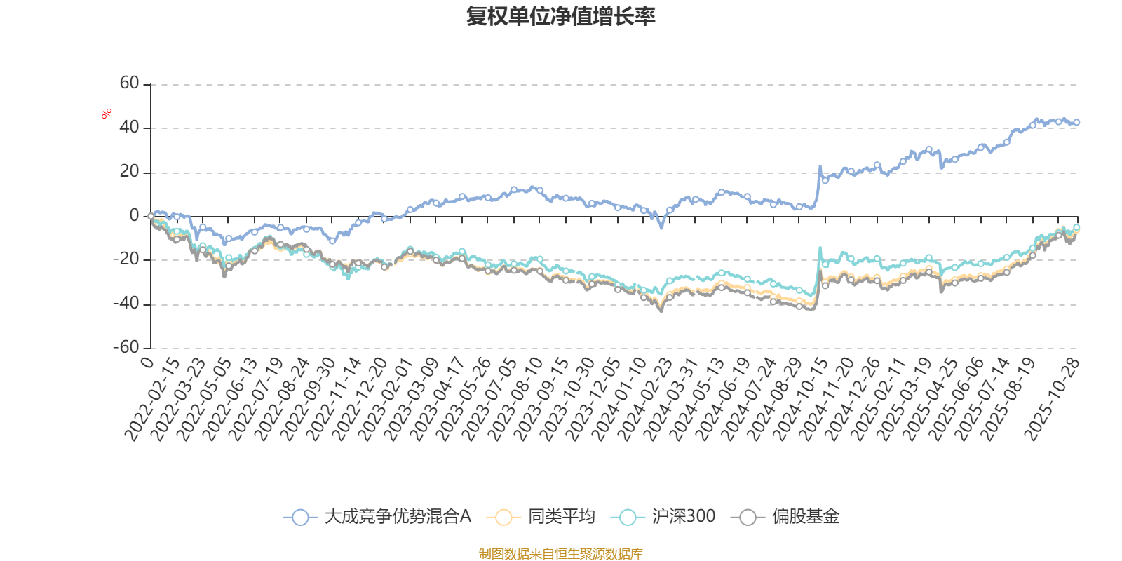 截至10月28日,大成竞争优势混合A近三个月复权单位净值增长率为2.70%,位于同类可比基金118/130;近半年复权单位净值增长率为13.71%,位于同类可比基金110/130;近一年复权单位净值增长率为19.32%,位于同类可比基金85/130;近三年复权单位净值增长率为56.03%,位于同类可比基金18/124。
