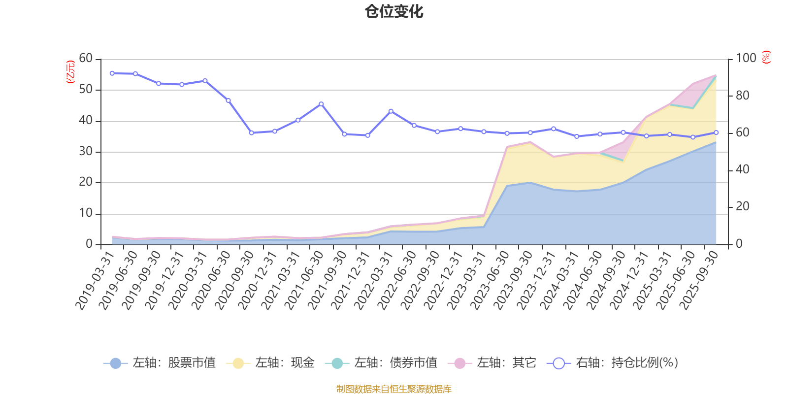 据定期报告数据统计,近三年平均股票仓位为60.06%,同类平均为86.15%。2019年一季度末基金达到92.35%的最高仓位,2025年上半年末最低,为57.92%。