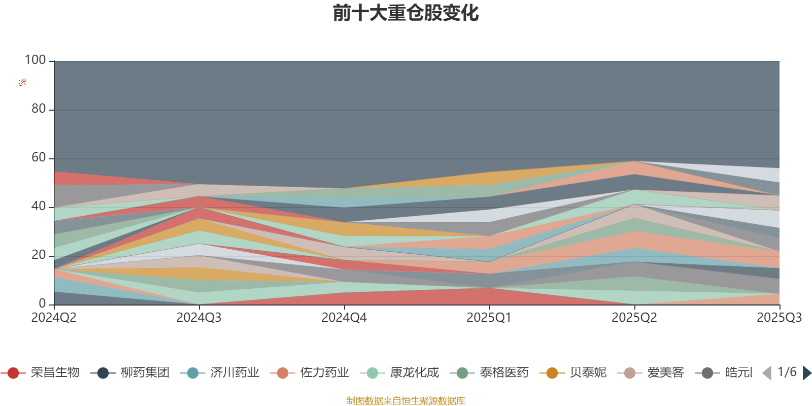 截至2025年三季度末,基金十大重仓股分别是迈威生物、百普赛斯、皓元医药、成都先导、诺思格、阳光诺和、汇宇制药、佐力药业、甘李药业、悦康药业。
