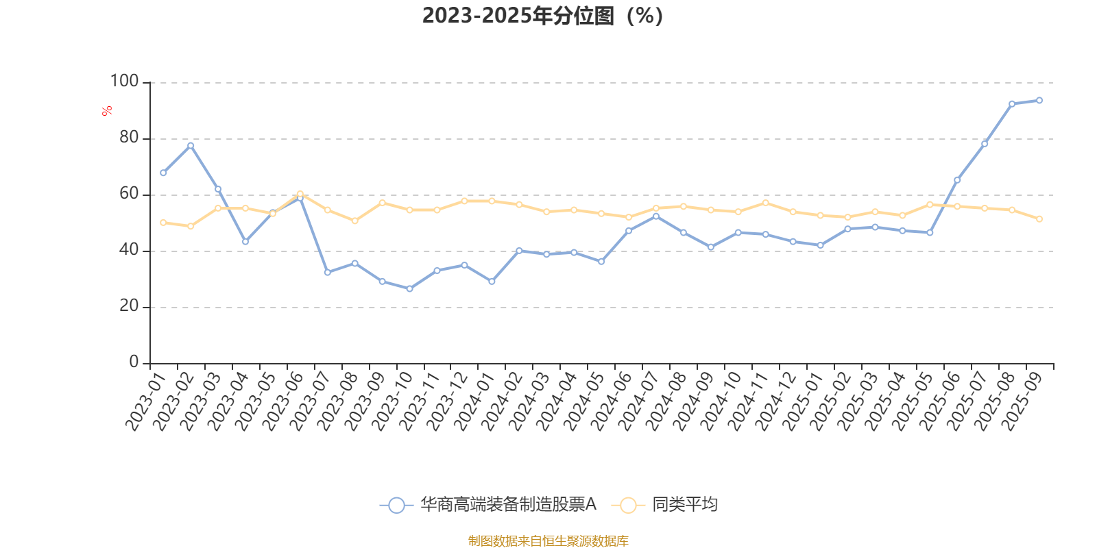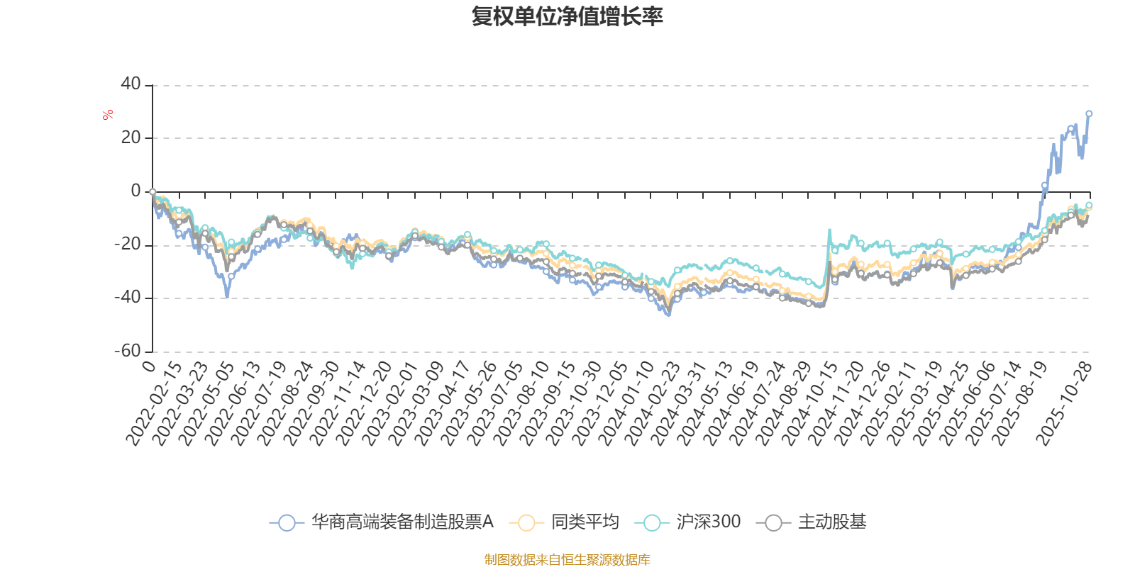 截至10月28日,华商高端装备制造股票A近三个月复权单位净值增长率为49.85%,位于同类可比基金2/167;近半年复权单位净值增长率为88.64%,位于同类可比基金1/166;近一年复权单位净值增长率为84.49%,位于同类可比基金3/164;近三年复权单位净值增长率为58.05%,位于同类可比基金23/156。