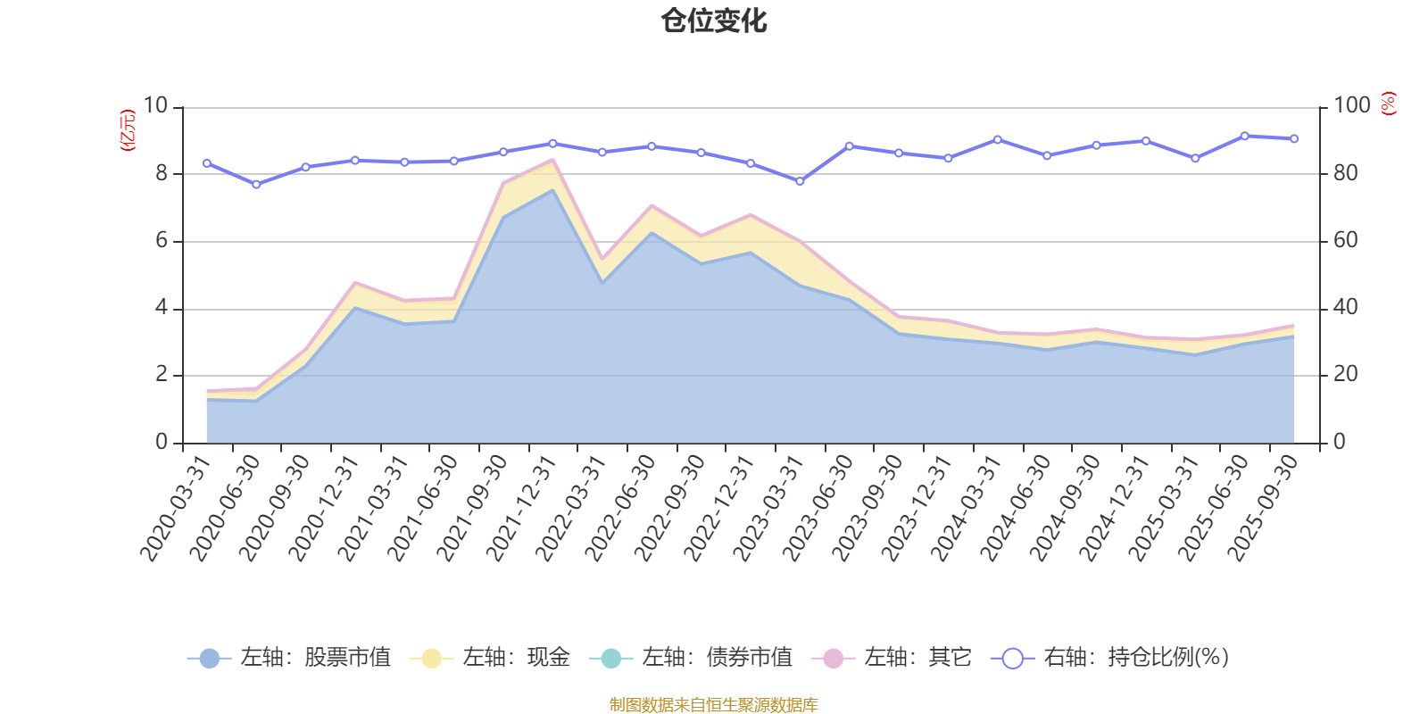 据定期报告数据统计,近三年平均股票仓位为86.83%,同类平均为88.27%。2025年上半年末基金达到91.42%的最高仓位,2020年上半年末最低,为76.99%。