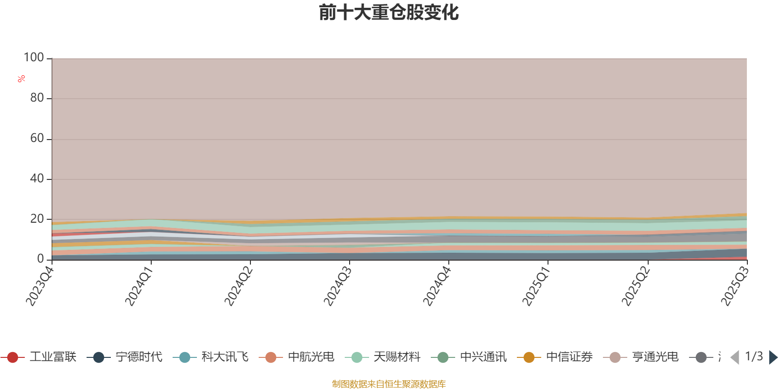且持股标的较为稳定。截至2025年三季度末,基金十大重仓股分别是宁德时代、海光信息、浪潮信息、北方华创、中航光电、天赐材料、华大九天、澜起科技、工业富联、亿纬锂能。