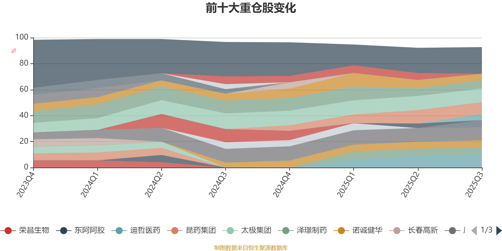 该基金持股集中度较高,近2年前十大重仓股集中度长期超过60%。截至2025年三季度末,基金十大重仓股分别是百利天恒、迪哲医药、康弘药业、科伦博泰生物-B、恒瑞医药、三生制药、诺诚健华、泽璟制药、华东医药、特宝生物。
