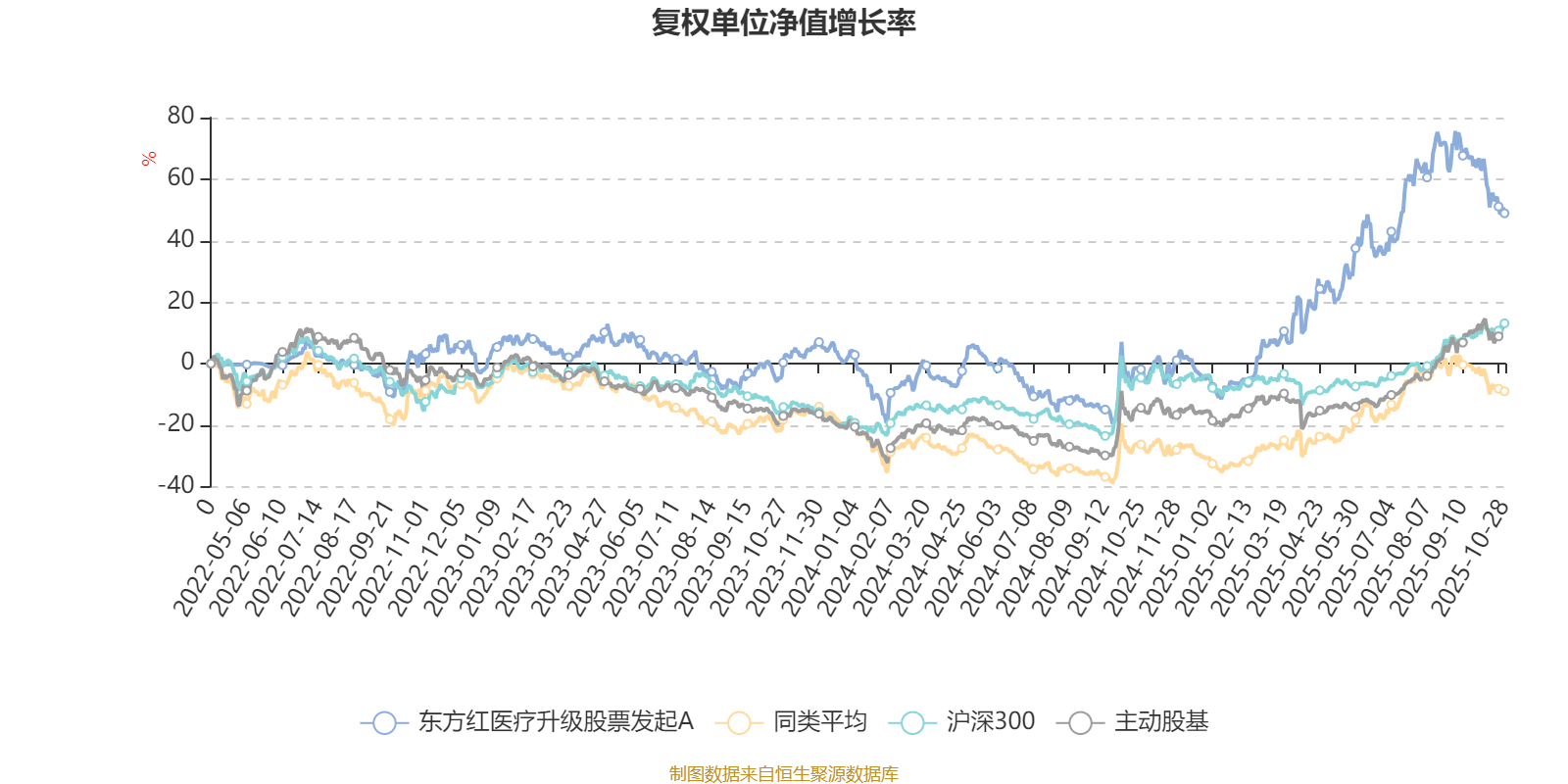 截至10月28日,东方红医疗升级股票发起A近三个月复权单位净值增长率为-8.40%,位于同类可比基金41/57;近半年复权单位净值增长率为20.68%,位于同类可比基金33/57;近一年复权单位净值增长率为51.80%,位于同类可比基金4/55;近三年复权单位净值增长率为48.46%,位于同类可比基金5/48。