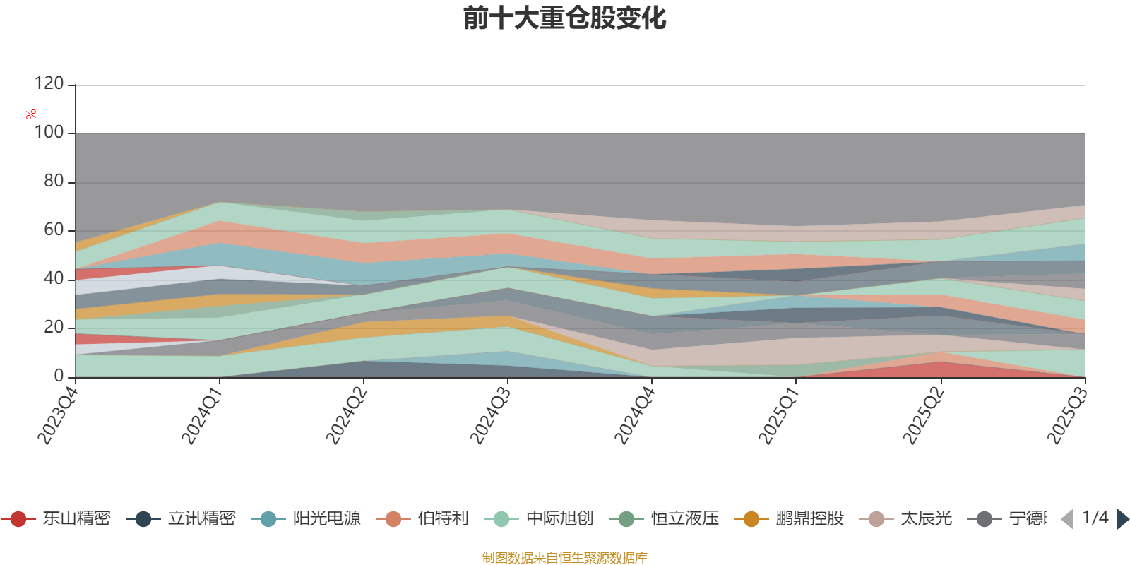 该基金持股集中度较高。截至2025年三季度末,基金十大重仓股分别是中际旭创、新易盛、沪电股份、工业富联、胜宏科技、宁德时代、源杰科技、兆易创新、拓普集团、浙江荣泰。
