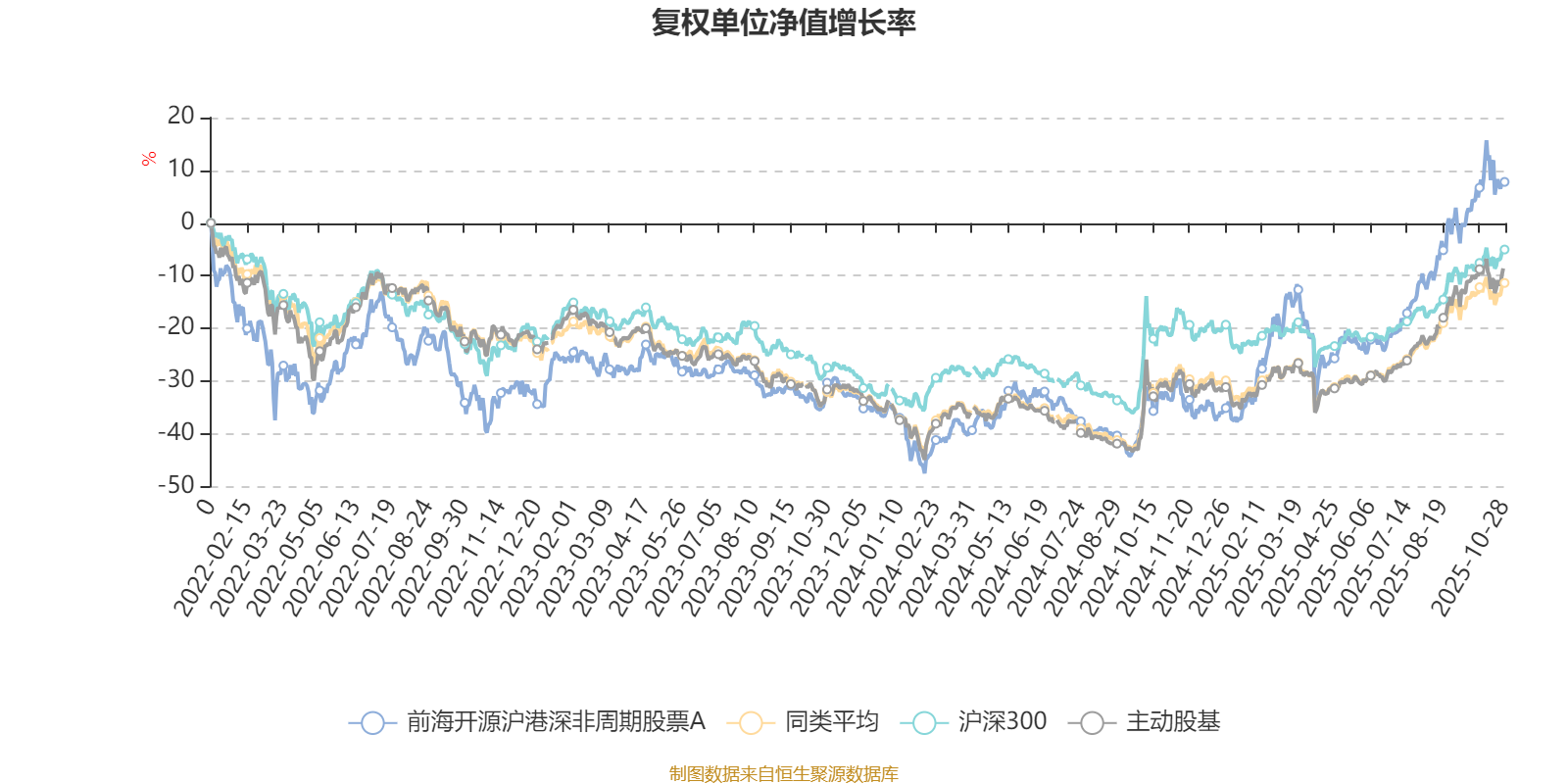 截至10月28日,前海开源沪港深非周期股票A近三个月复权单位净值增长率为21.37%,位于同类可比基金38/121;近半年复权单位净值增长率为44.88%,位于同类可比基金22/121;近一年复权单位净值增长率为58.79%,位于同类可比基金5/115;近三年复权单位净值增长率为77.57%,位于同类可比基金4/87。