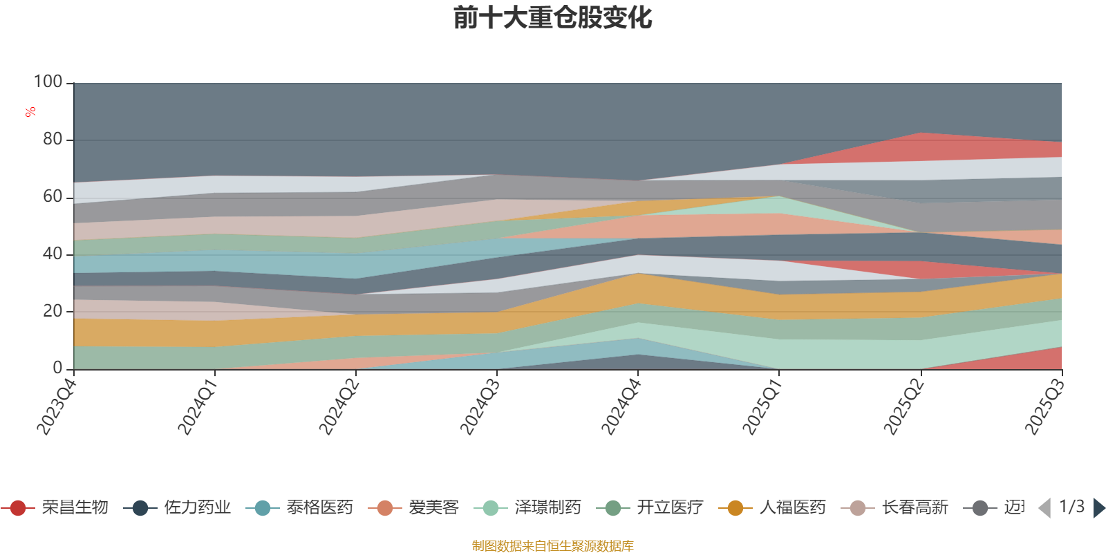 该基金持股集中度较高,近2年前十大重仓股集中度长期超过60%。截至2025年三季度末,基金十大重仓股分别是恒瑞医药、百济神州、泽璟制药、人福医药、华东医药、荣昌生物、开立医疗、奕瑞科技、药明康德、新诺威。
