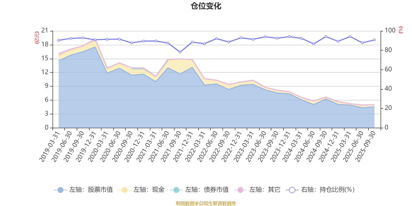 据定期报告数据统计,近三年平均股票仓位为91.63%,同类平均为88.38%。2025年一季度末基金达到94.19%的最高仓位,2021年三季度末最低,为78.11%。
