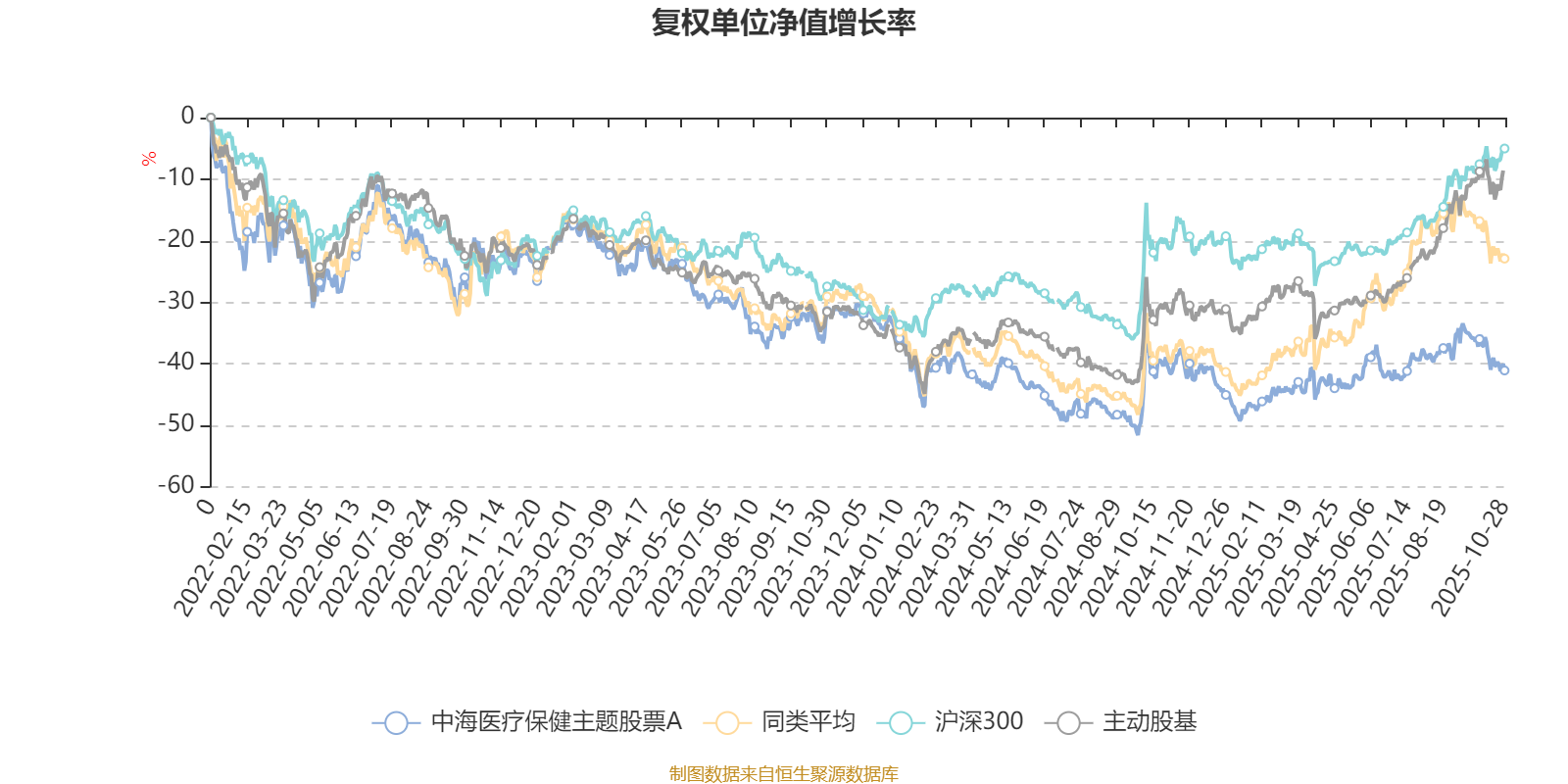 截至10月28日,中海医疗保健主题股票A近三个月复权单位净值增长率为-4.02%,位于同类可比基金18/57;近半年复权单位净值增长率为5.28%,位于同类可比基金53/57;近一年复权单位净值增长率为-3.52%,位于同类可比基金52/55;近三年复权单位净值增长率为-21.08%,位于同类可比基金43/48。