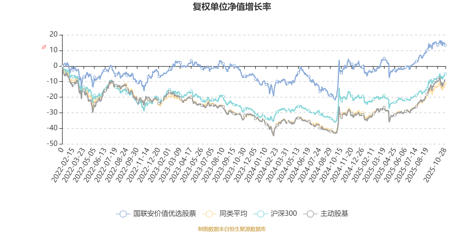 截至10月28日,国联安价值优选股票近三个月复权单位净值增长率为6.09%,位于同类可比基金87/121;近半年复权单位净值增长率为17.19%,位于同类可比基金89/121;近一年复权单位净值增长率为12.49%,位于同类可比基金93/115;近三年复权单位净值增长率为33.33%,位于同类可比基金30/87。