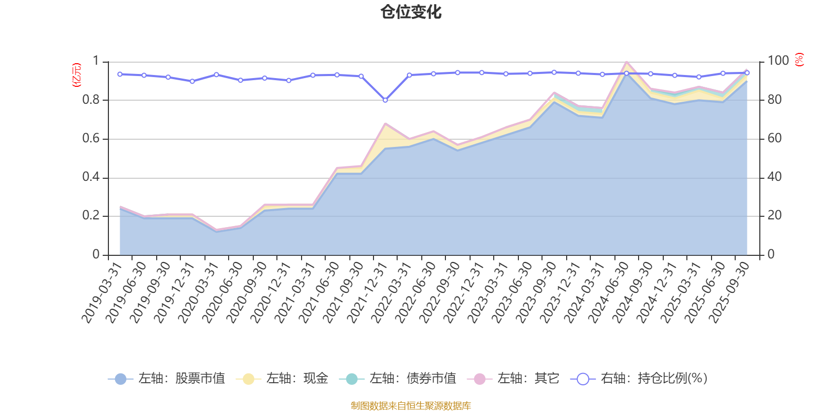 据定期报告数据统计,近三年平均股票仓位为93.75%,同类平均为88.23%。2023年三季度末基金达到94.49%的最高仓位,2021年末最低,为80.11%。