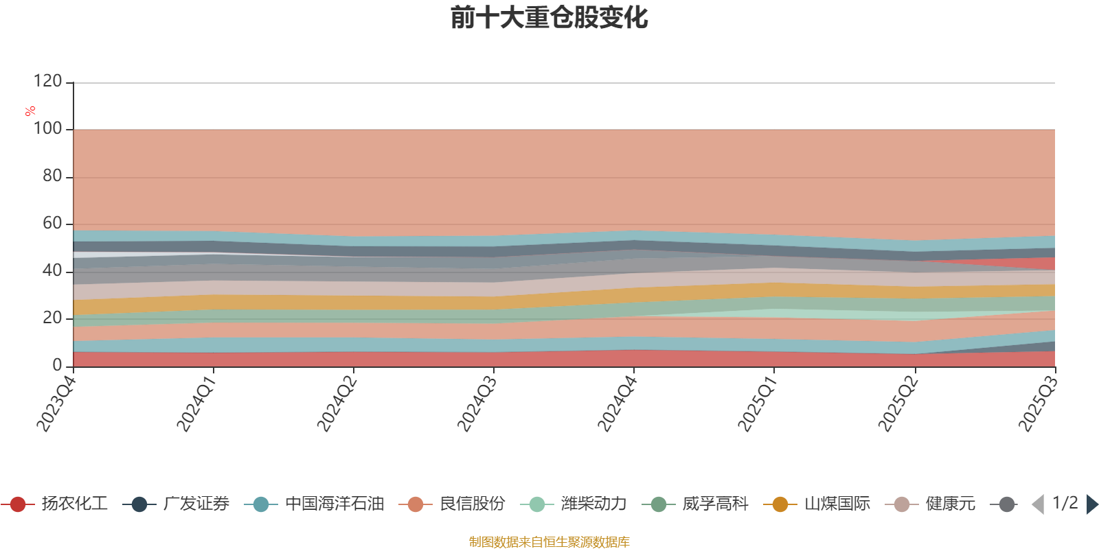 该基金持股集中度较高,且持股标的较为稳定。截至2025年三季度末,基金十大重仓股分别是良信股份、扬农化工、威孚高科、健康元、海力风电、金地集团、山煤国际、中国海洋石油、广发证券、河钢资源。