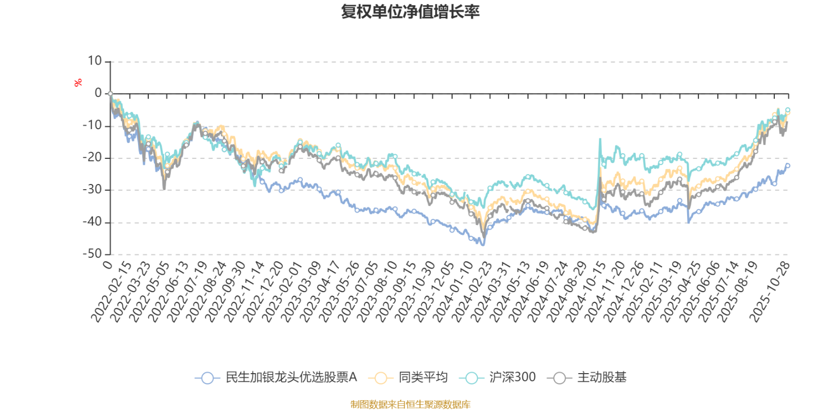 截至10月28日,民生加银龙头优选股票A近三个月复权单位净值增长率为12.15%,位于同类可比基金105/167;近半年复权单位净值增长率为21.94%,位于同类可比基金122/166;近一年复权单位净值增长率为19.78%,位于同类可比基金122/164;近三年复权单位净值增长率为7.53%,位于同类可比基金117/156。
