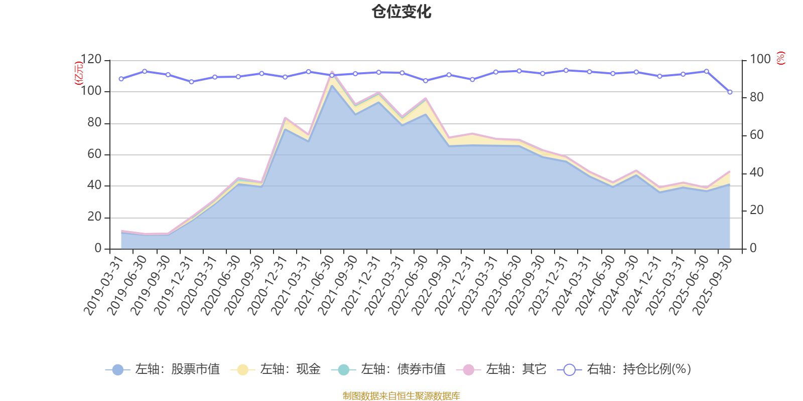 据定期报告数据统计,近三年平均股票仓位为92.25%,同类平均为87.59%。2023年末基金达到94.59%的最高仓位,2025年三季度末最低,为83.09%。