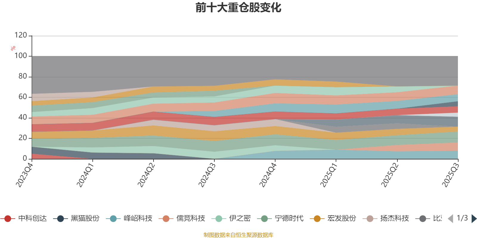 该基金持股集中度较高,近2年前十大重仓股集中度长期超过60%。截至2025年三季度末,基金十大重仓股分别是宁德时代、伟创电气、三花智控、儒竞科技、峰岹科技、拓普集团、新泉股份、亿纬锂能、宏发股份、银轮股份。