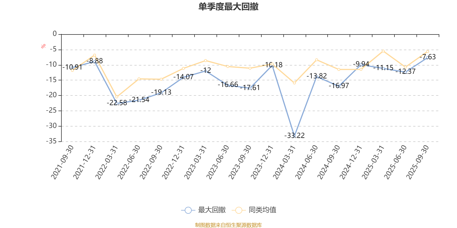 截至10月27日,基金近三年最大回撤为50.4%,同类可比基金排名147/156。单季度最大回撤出现在2024年一季度,为33.22%。