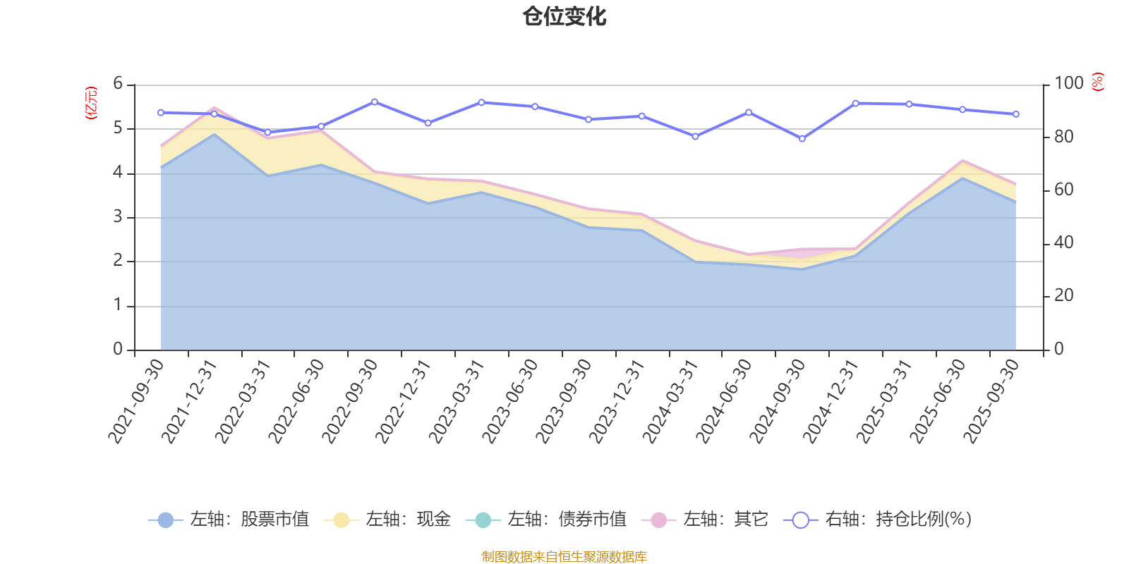 据定期报告数据统计,近三年平均股票仓位为88.36%,同类平均为88.27%。2022年三季度末基金达到93.48%的最高仓位,2024年三季度末最低,为79.64%。
