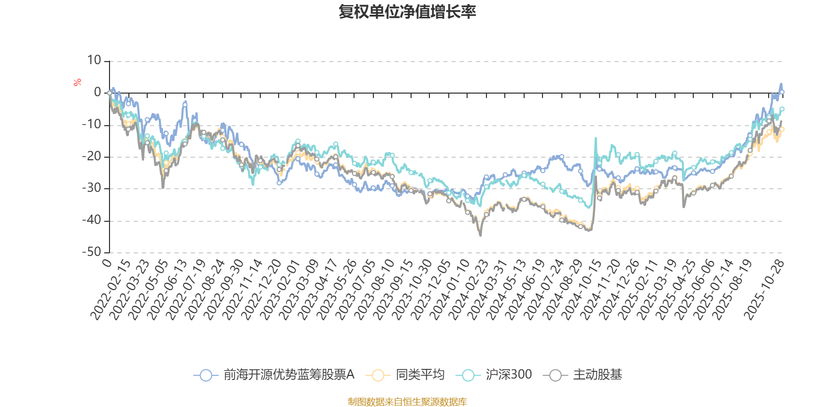 截至10月28日,前海开源优势蓝筹股票A近三个月复权单位净值增长率为21.74%,位于同类可比基金35/121;近半年复权单位净值增长率为33.15%,位于同类可比基金46/121;近一年复权单位净值增长率为33.89%,位于同类可比基金37/115;近三年复权单位净值增长率为27.14%,位于同类可比基金37/87。