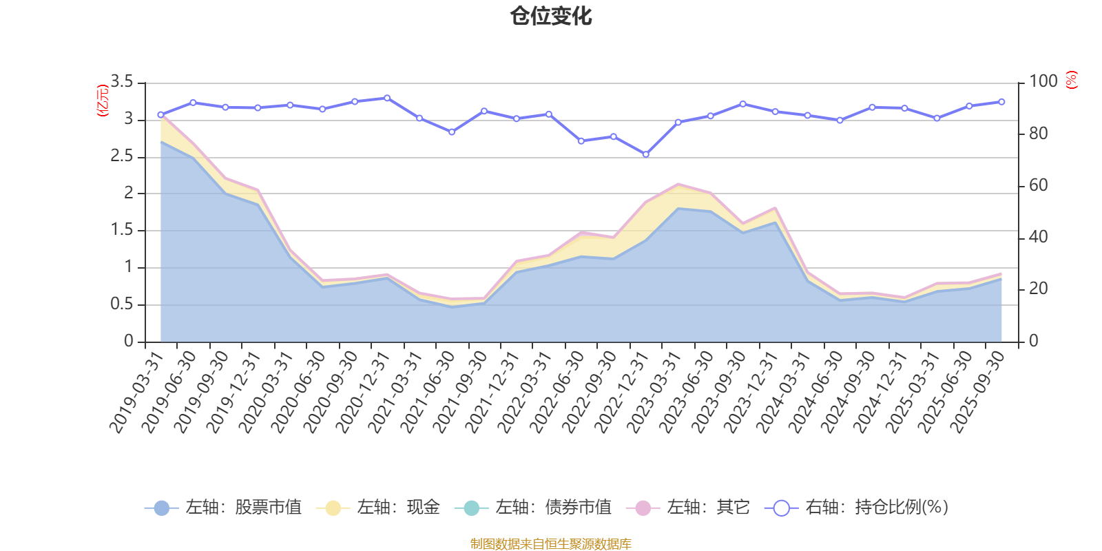 据定期报告数据统计,近三年平均股票仓位为87.36%,同类平均为88.29%。2020年末基金达到94.08%的最高仓位,2022年末最低,为72.35%。