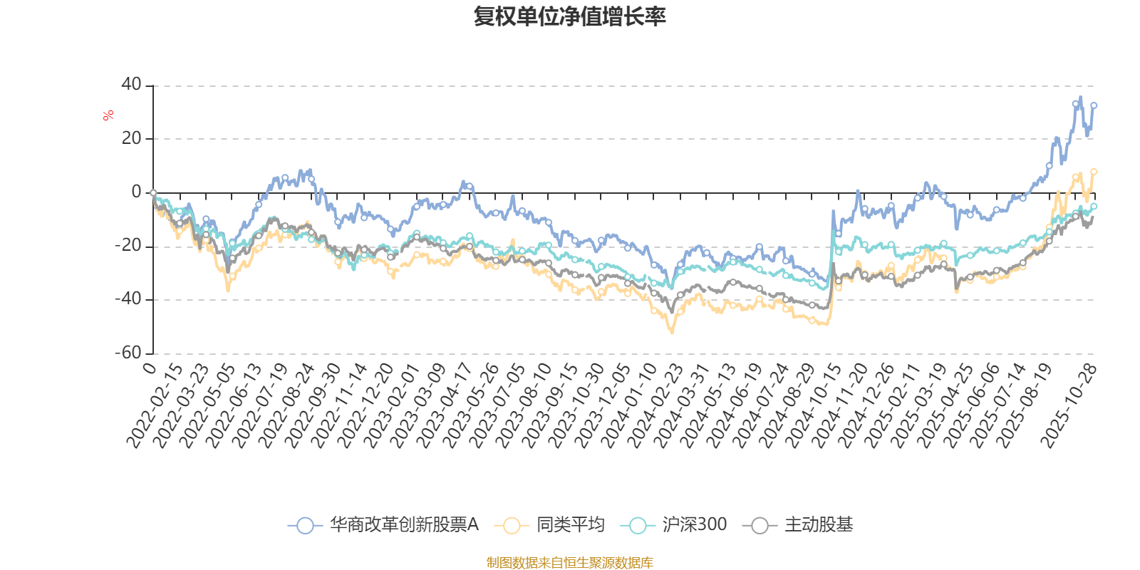 截至10月28日,华商改革创新股票A近三个月复权单位净值增长率为29.60%,位于同类可比基金44/63;近半年复权单位净值增长率为43.90%,位于同类可比基金42/63;近一年复权单位净值增长率为47.99%,位于同类可比基金40/61;近三年复权单位净值增长率为49.20%,位于同类可比基金27/51。