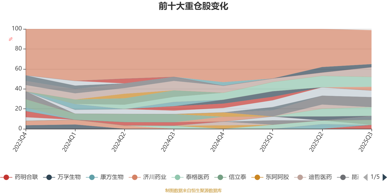 截至2025年三季度末,基金十大重仓股分别是药明康德、信达生物、恒瑞医药、三生制药、科伦博泰生物-B、信立泰、石药集团、药明合联、康诺亚-B、昭衍新药。