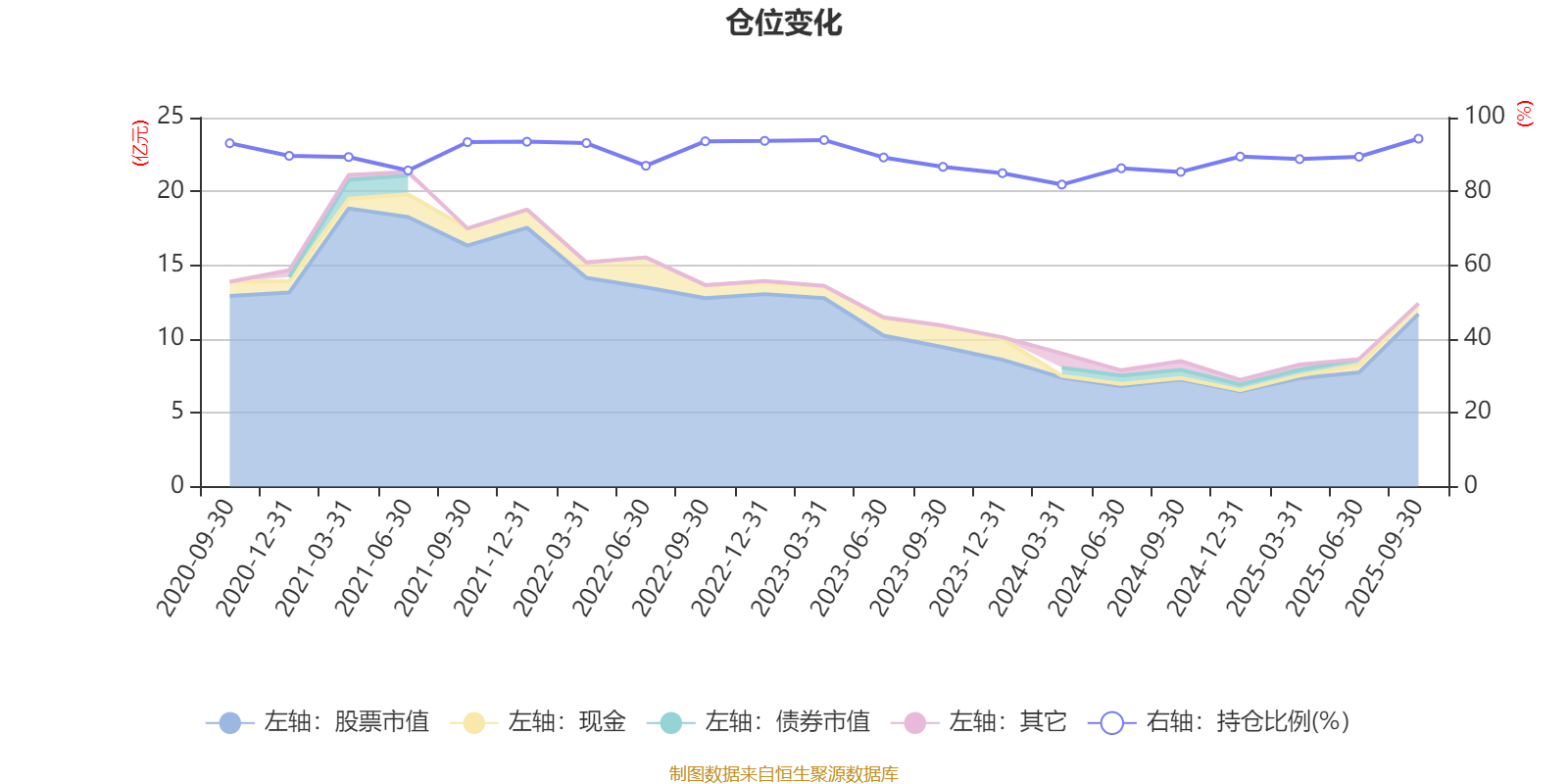 据定期报告数据统计,近三年平均股票仓位为88.64%,同类平均为88.27%。2025年三季度末基金达到94.28%的最高仓位,2024年一季度末最低,为81.85%。