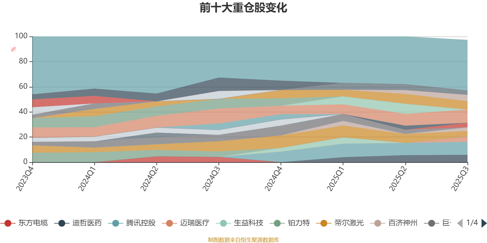 该基金持股集中度较高。截至2025年三季度末,基金十大重仓股分别是中芯国际、腾讯控股、理想汽车-W、迪哲医药、新意网集团、迈瑞医疗、帝尔激光、康诺亚-B、祥源文旅、百济神州。
