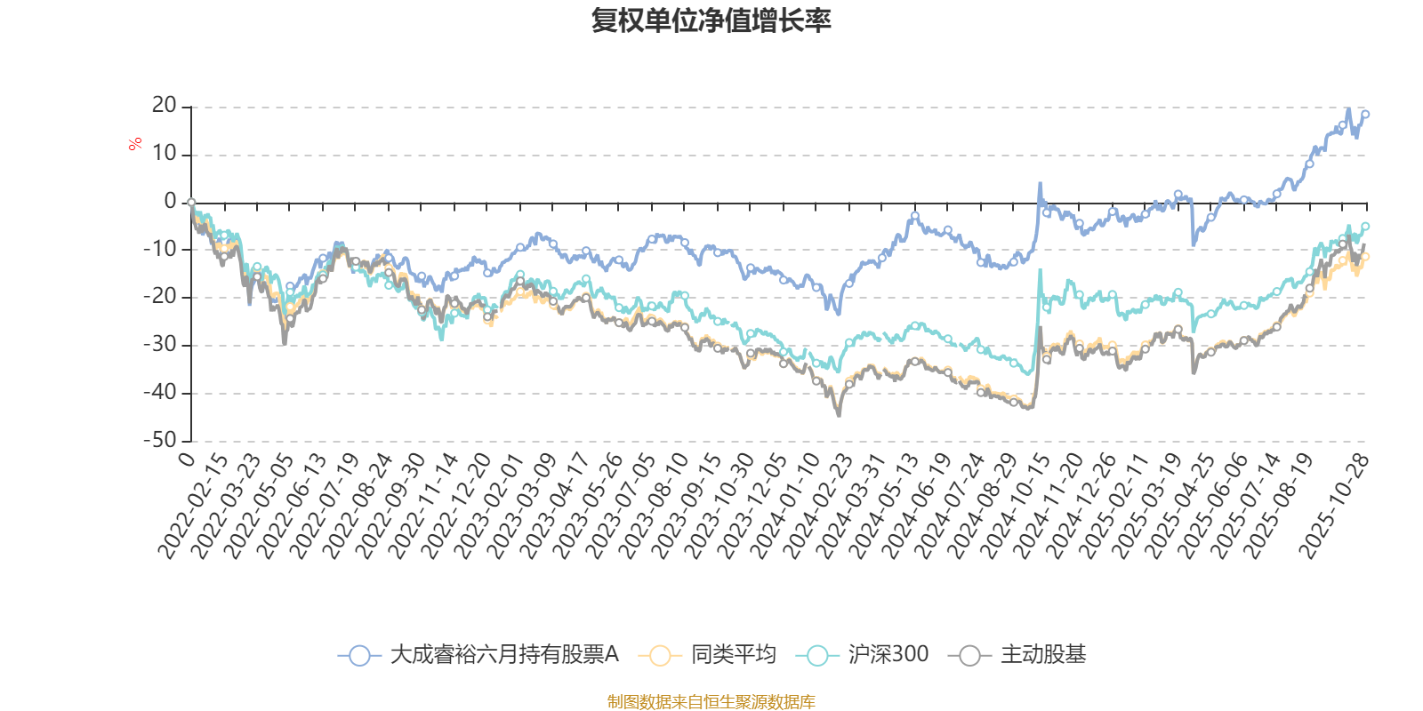 截至10月28日,大成睿裕六月持有股票A近三个月复权单位净值增长率为13.06%,位于同类可比基金63/121;近半年复权单位净值增长率为22.32%,位于同类可比基金78/121;近一年复权单位净值增长率为20.11%,位于同类可比基金69/115;近三年复权单位净值增长率为44.77%,位于同类可比基金19/87。