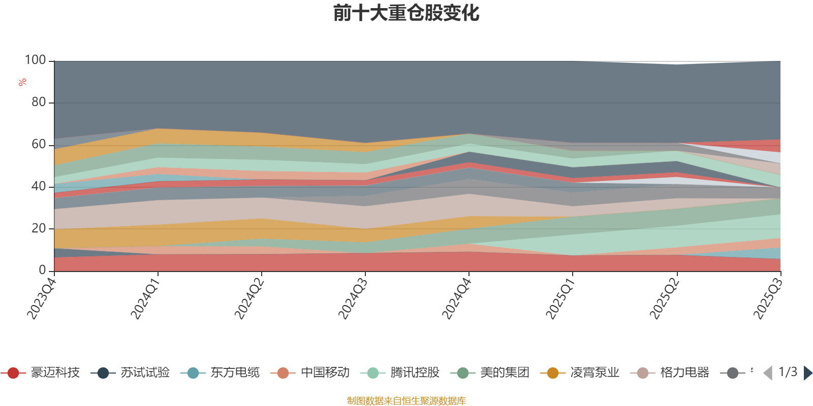 该基金持股集中度较高,近2年前十大重仓股集中度长期超过60%。截至2025年三季度末,基金十大重仓股分别是腾讯控股、美的集团、松原安全、中国海洋石油、豪迈科技、东方电缆、亿纬锂能、安徽合力、宁德时代、中国移动。