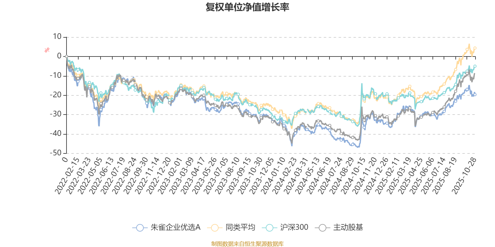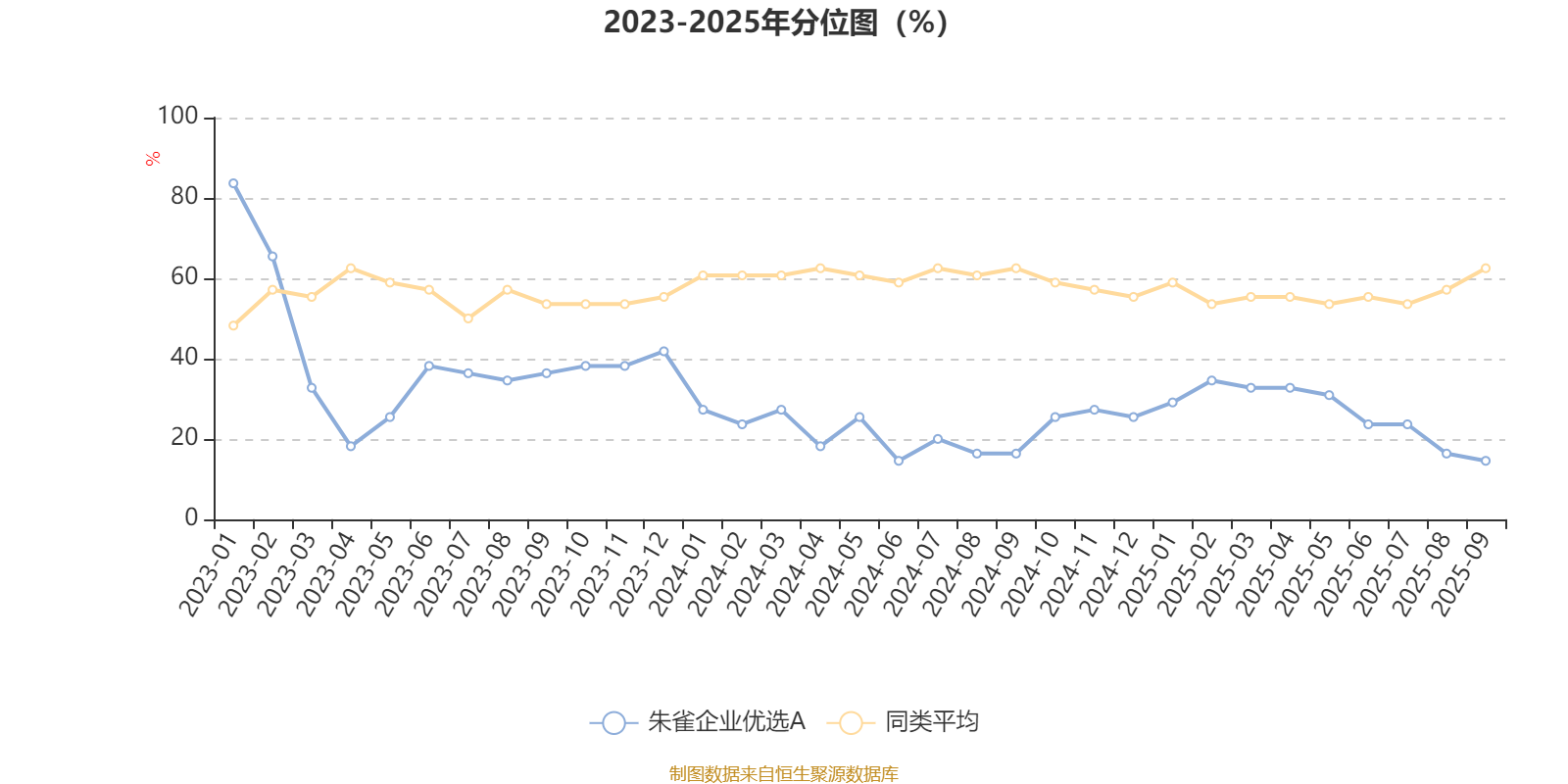 截至10月28日,朱雀企业优选A近三个月复权单位净值增长率为7.10%,位于同类可比基金45/58;近半年复权单位净值增长率为15.74%,位于同类可比基金46/57;近一年复权单位净值增长率为15.03%,位于同类可比基金49/57;近三年复权单位净值增长率为7.54%,位于同类可比基金47/56。
