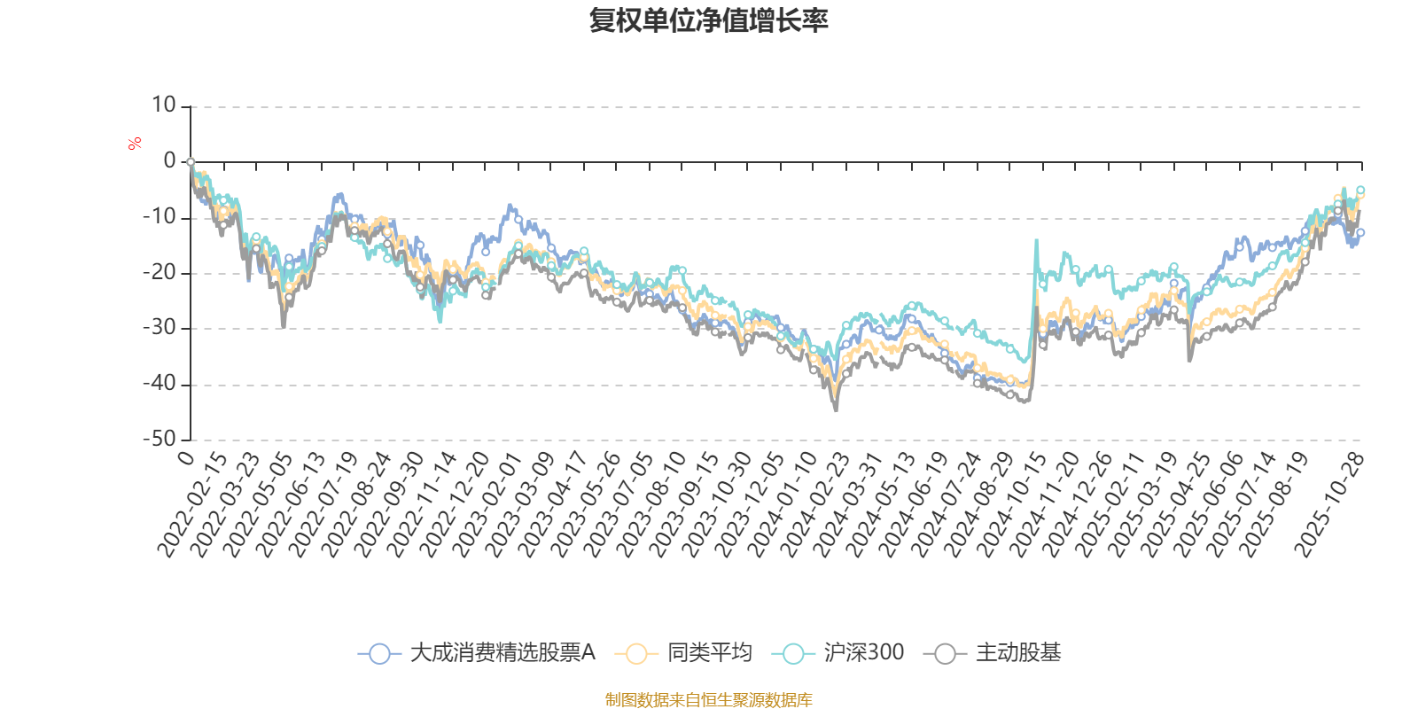截至10月28日,大成消费精选股票A近三个月复权单位净值增长率为1.71%,位于同类可比基金160/167;近半年复权单位净值增长率为11.54%,位于同类可比基金158/166;近一年复权单位净值增长率为22.52%,位于同类可比基金108/164;近三年复权单位净值增长率为20.20%,位于同类可比基金89/156。