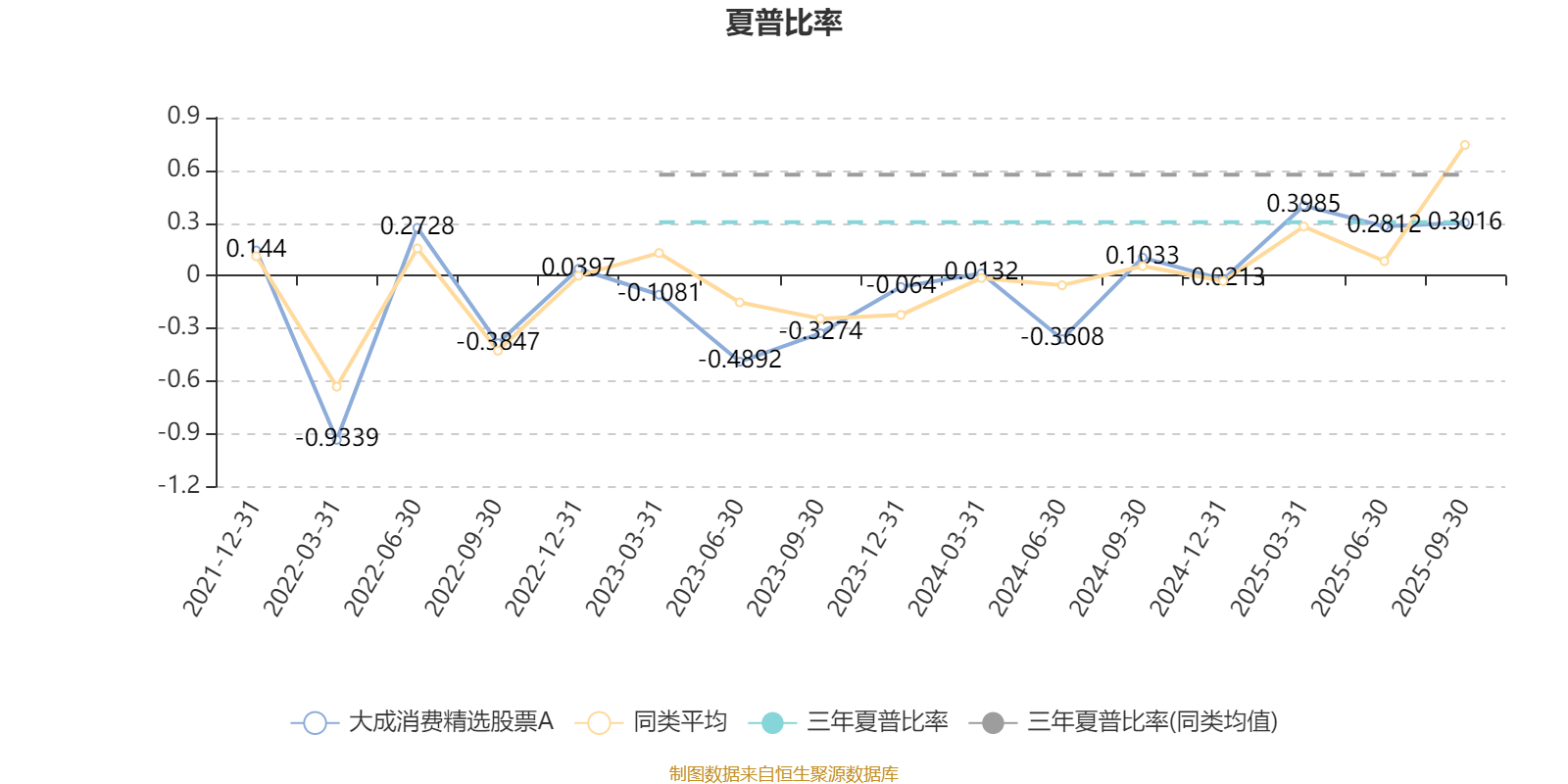 截至9月30日,基金近三年夏普比率为0.3043,位于同类可比基金122/156。