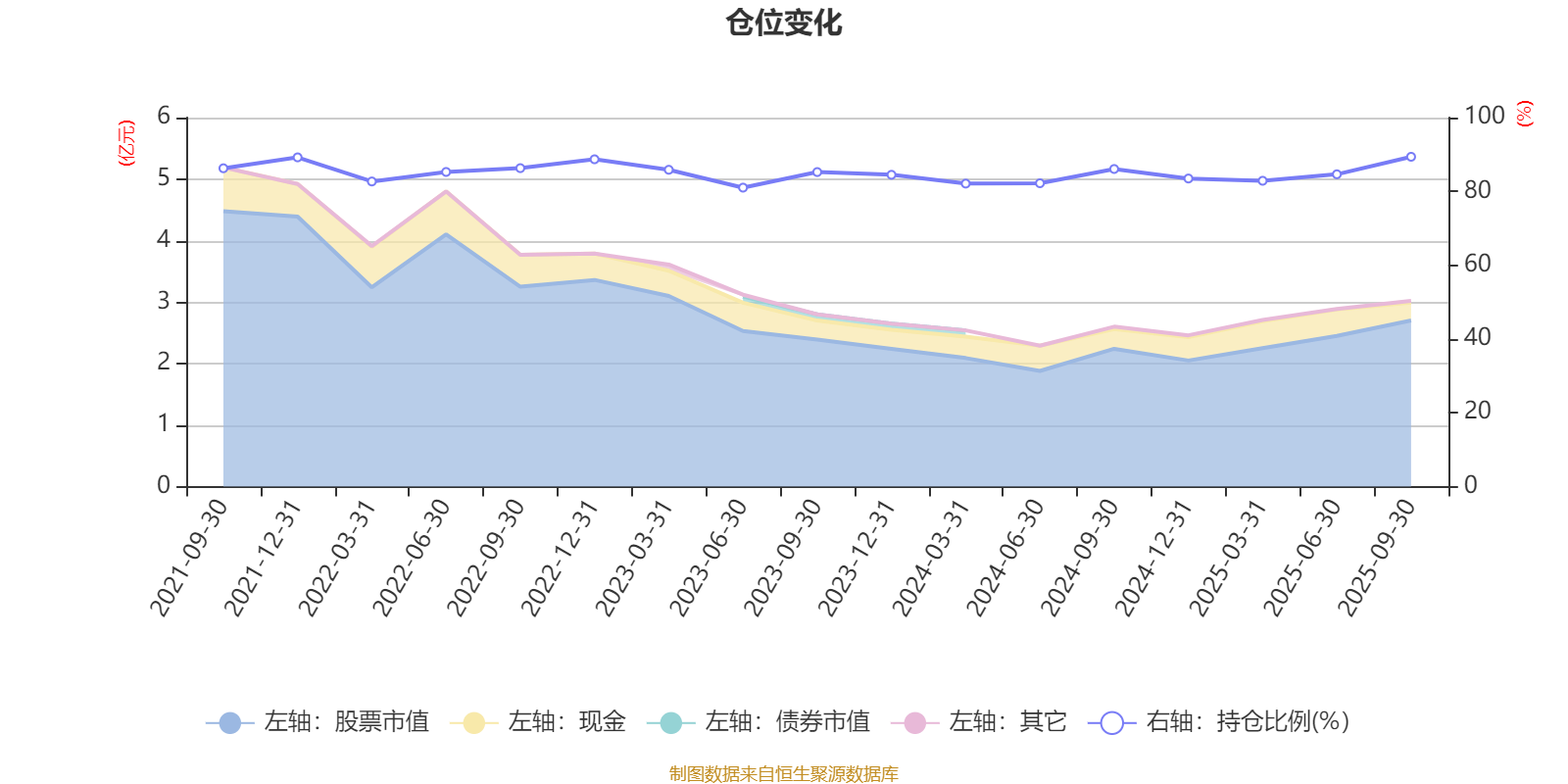据定期报告数据统计,近三年平均股票仓位为84.68%,同类平均为88.27%。2025年三季度末基金达到89.38%的最高仓位,2023年上半年末最低,为81.02%。